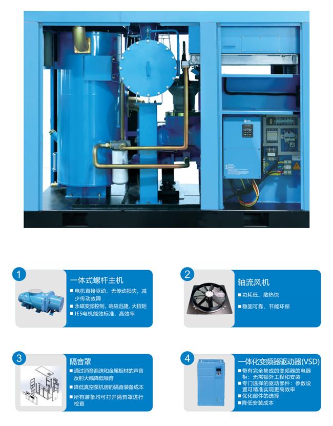 螺杆经过精细动平衡校正,运转平稳,噪声低、振动小,使用寿命长。